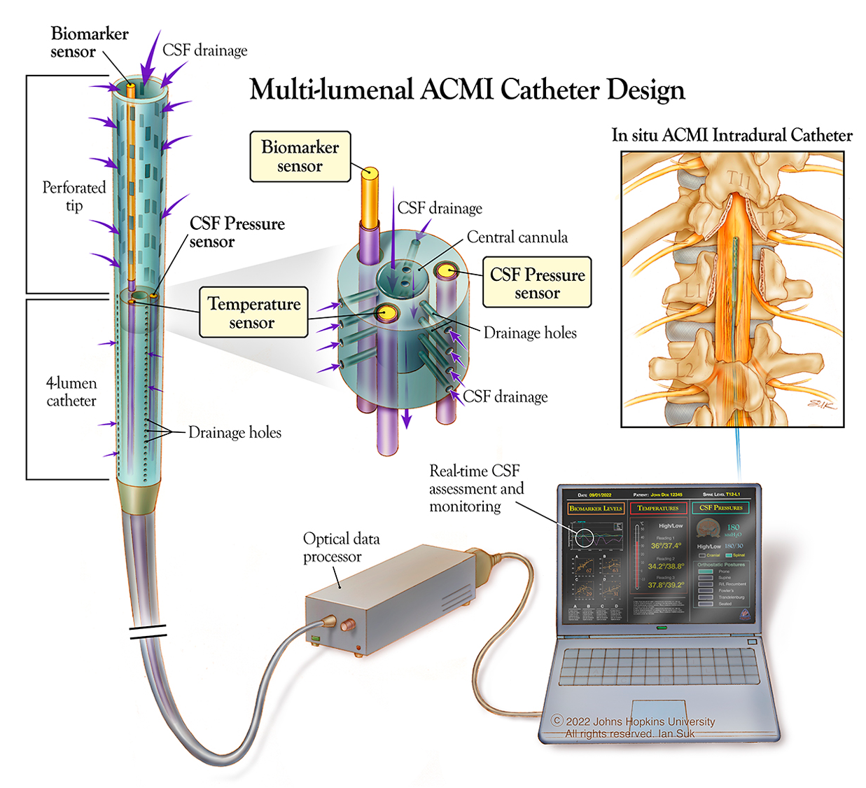 A smart spinal fluid drainage catheter, equipped with sensing a variety of biomarkers