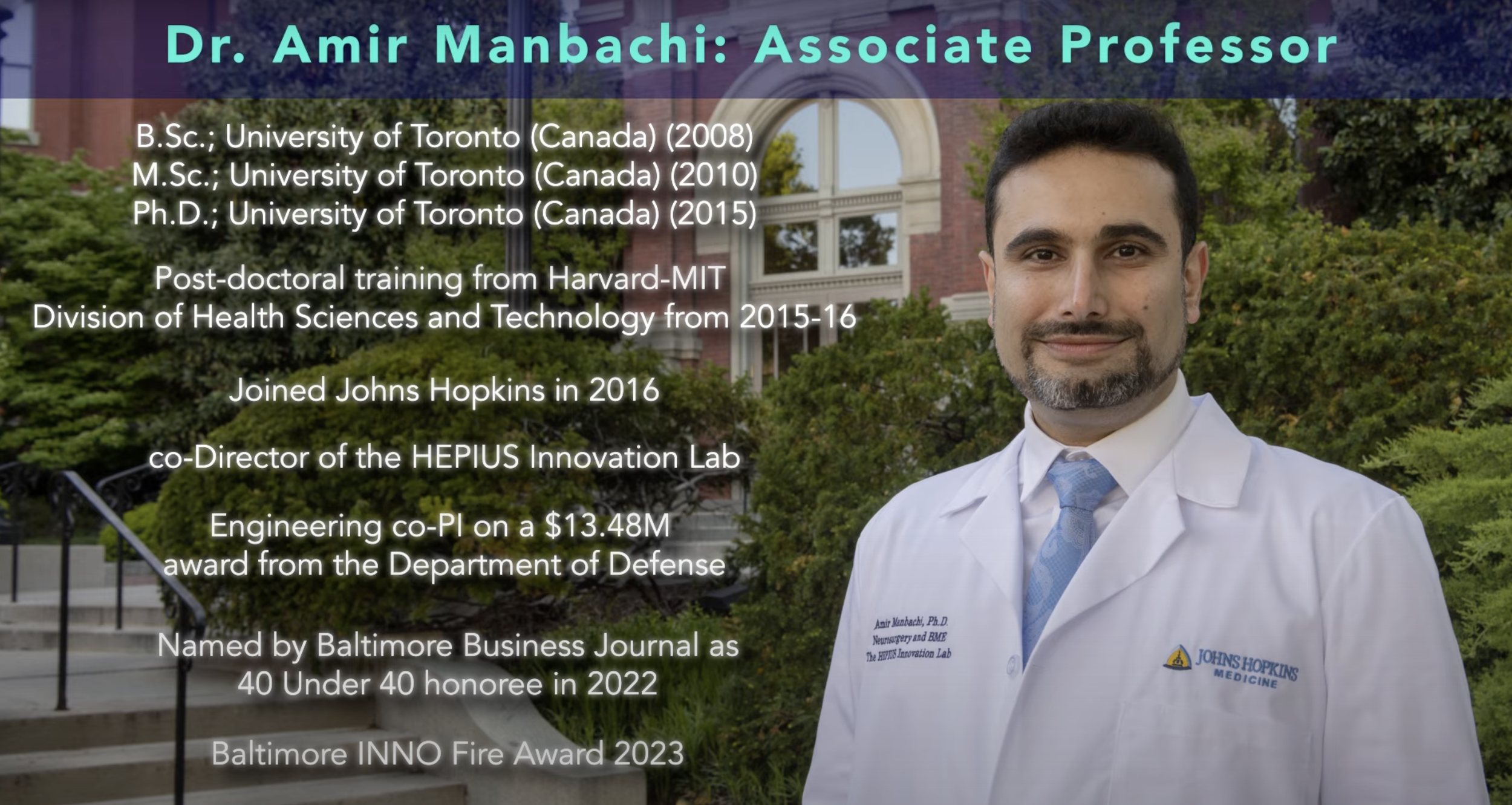 Johns Hopkins HEPIUS Innovation Lab is pleased to announce the promotion of Dr. Amir Manbachi to the rank of Associate Professor of Neurological Surgery, with a secondary appointment in Biomedical Engineering, effective December 1, 2023